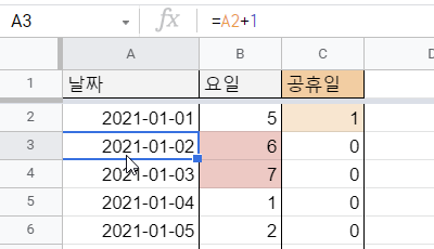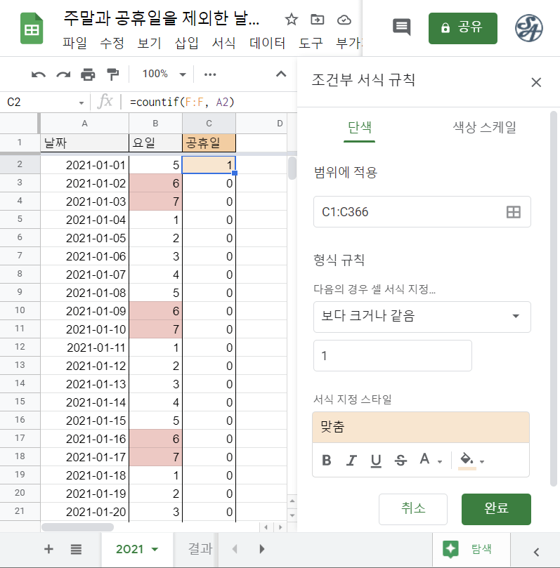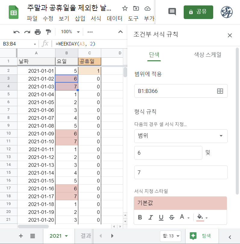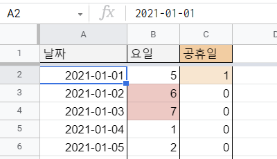 참고로, 2021시트에서는 조건부 서식을 사용하여 B열 중에 주말인 토요일, 일요일에는 빨간색 배경색이, C열 중에 공휴일에는 주황색 배경색이 표시되도록 설정해두었습니다.