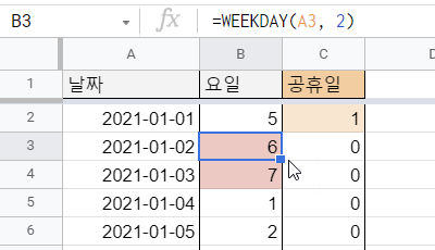 B열에서는 A열에 있는 날짜에 WEEKDAY 함수를 사용하여 요일에 해당하는 숫자를 추출하였습니다. 이때, 두 번째 입력값인 유형에 2를 설정하여 토요일은 6, 일요일은 7이 되도록 만들었습니다. 참고로, WEEKDAY 함수에서 두 번째 입력값 유형에 2를 설정하면, 월요일부터 번호를 매기기 시작하며 월요일은 1, 일요일은 7이 됩니다.