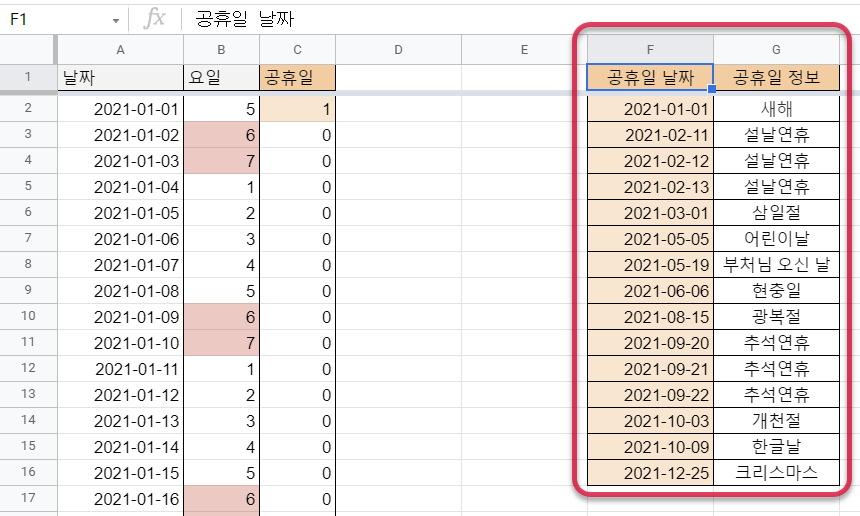 F, G 열에는 2021년의 공휴일의 날짜와 정보 테이블을 준비했습니다.