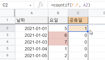 그리고 C열에서는 COUNTIF 함수를 사용하여 A열의 날짜가 F열에 몇 개 있는지 세도록 만들었습니다. A열의 날짜가 F열에 있는 날짜일 경우, 1이 나오게 됩니다. 즉, A열 날짜가 공휴일인 경우에는 1이 나오고, 그렇지 않은 경우에는 0이 나옵니다.