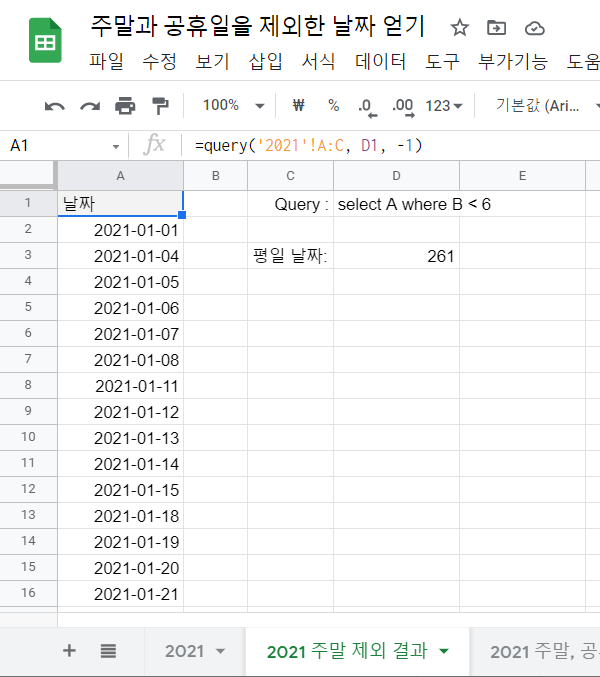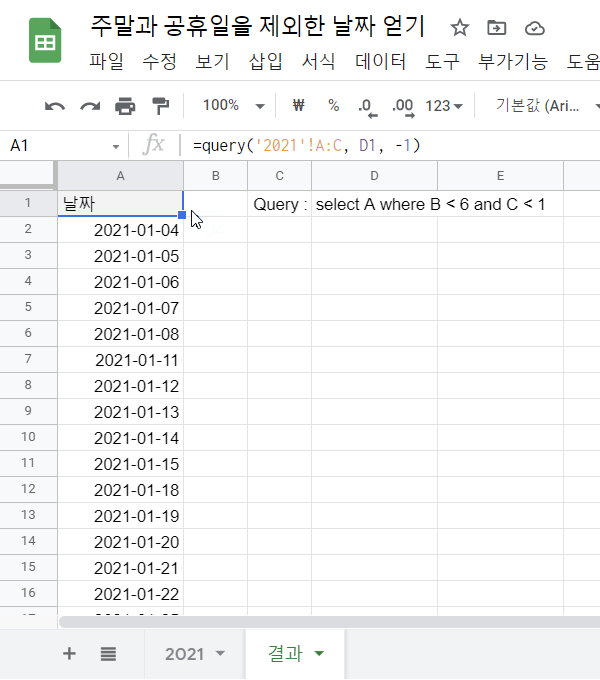 결과 시트에서 주말과 공휴일을 제외한 2021년도 날짜를 확인할 수 있습니다.