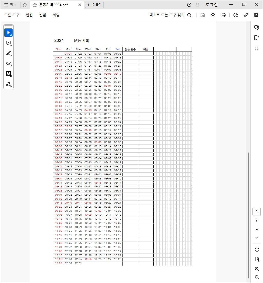 2024년 1년간 기록할 수 있도록 1년치 날짜를 일주일 단위로 표를 만들었습니다. 그리고 pdf 파일에는 스프레드시트에서는 표시하지 않았던 공휴일은 날짜를 빨간색으로 표시했습니다.