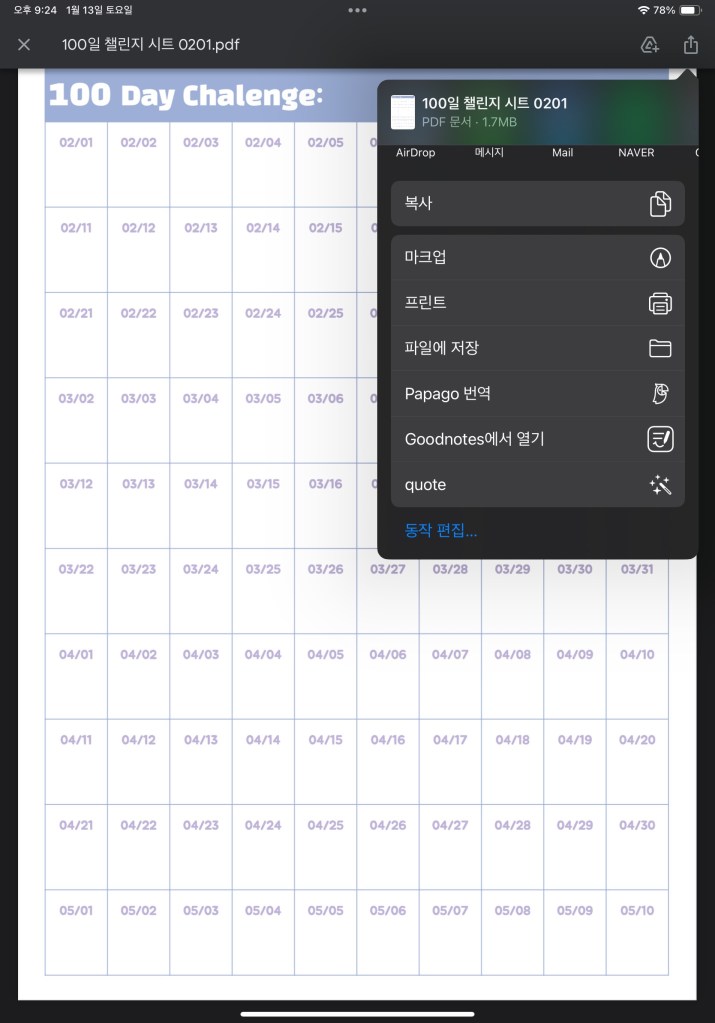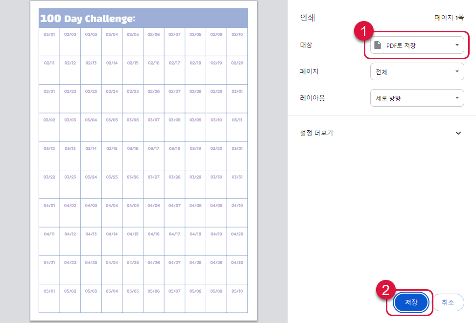 이전 포스팅 2024년 습관 만들기, 운동 기록 표 pdf파일 무료 공유 굿노트 속지 에 이어 습관 만들기에 도움이 될만한 100일 챌린지 시트를 만들어보았습니다.