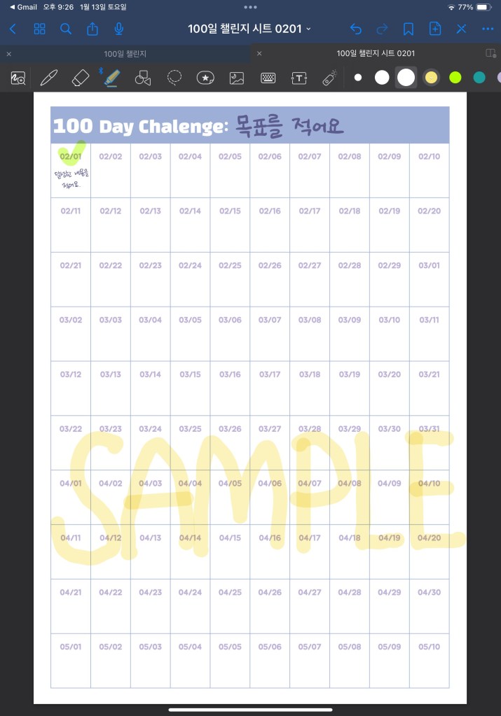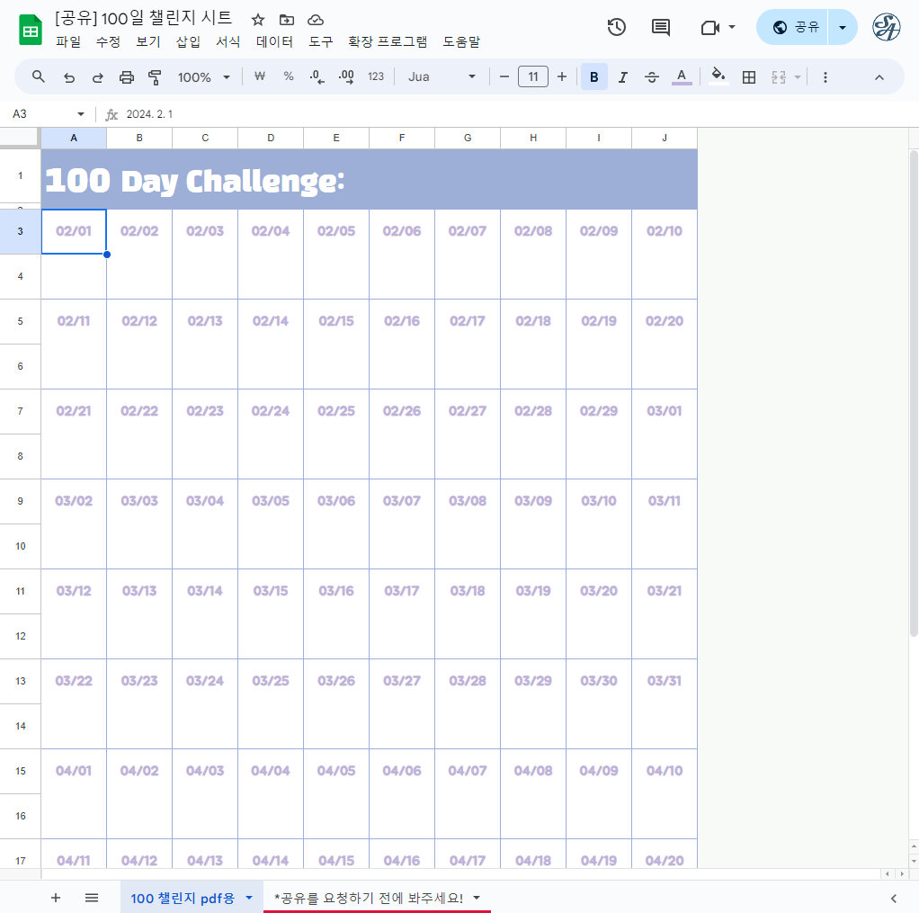 ★ 샘플 구글시트: [공유] 100일 챌린지 시트