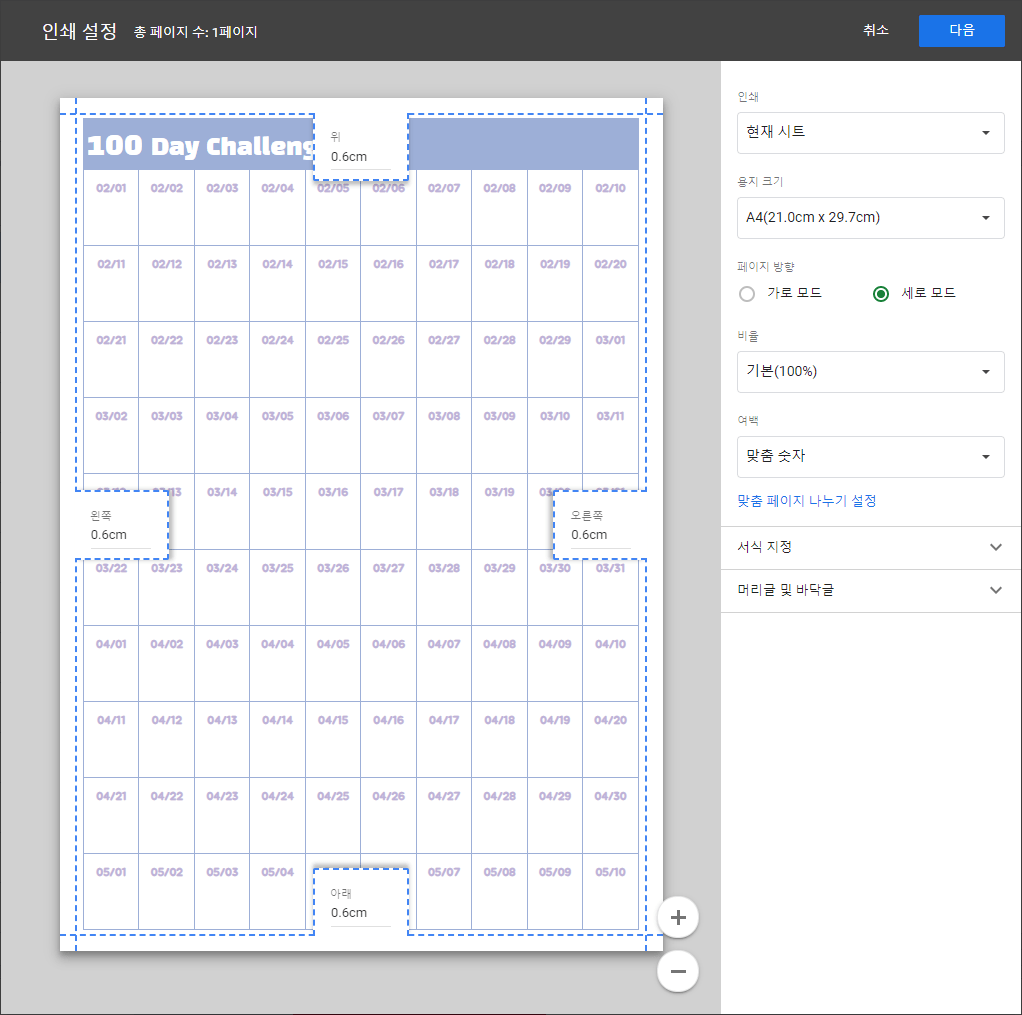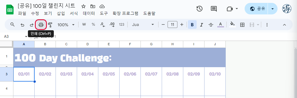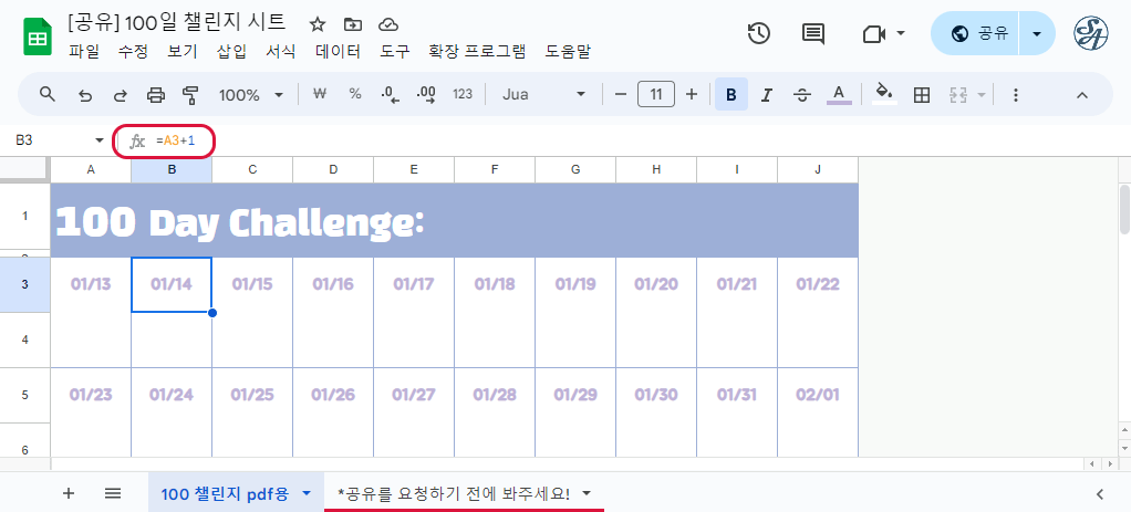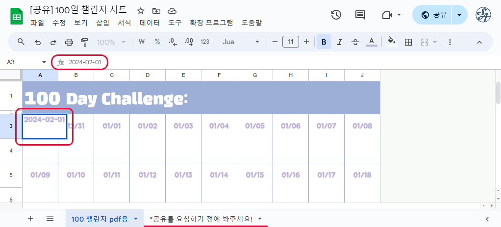 원하는 날짜로 시작하는 100일 챌린지 시트 만들기