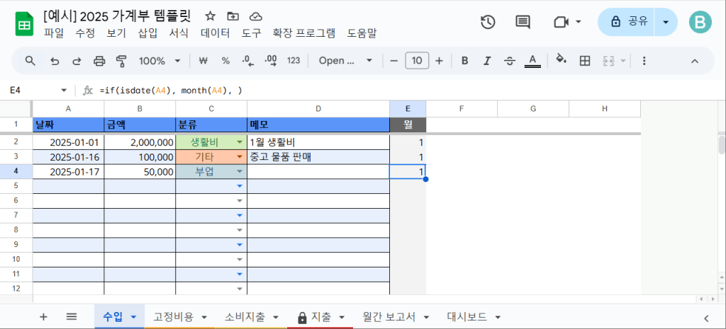 • C열 분류 ✳️: 수입의 카테고리를 입력하는 열