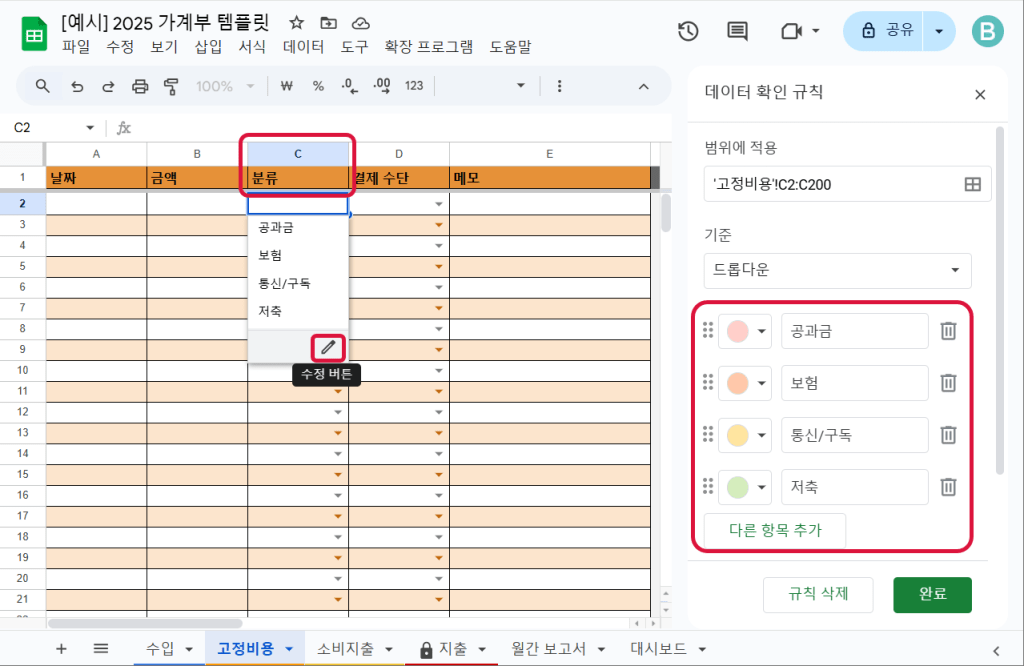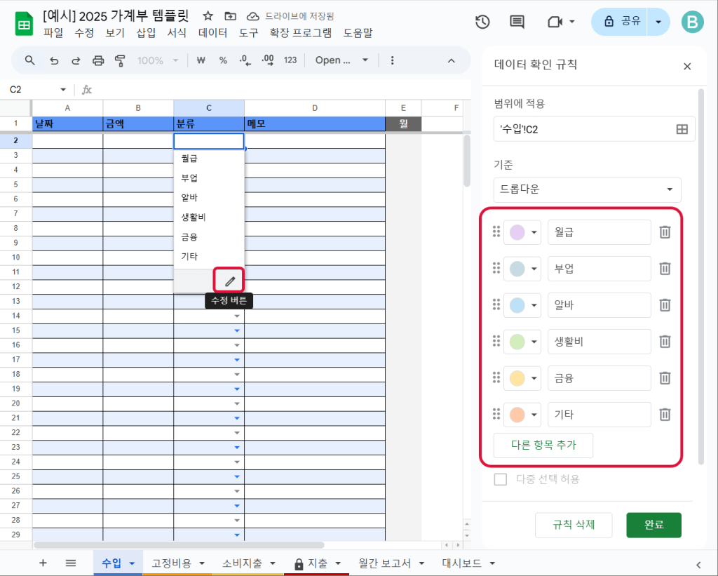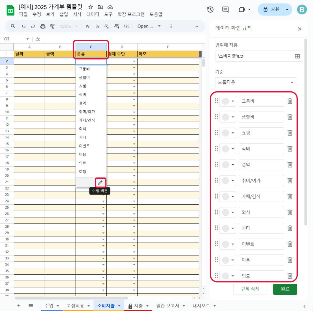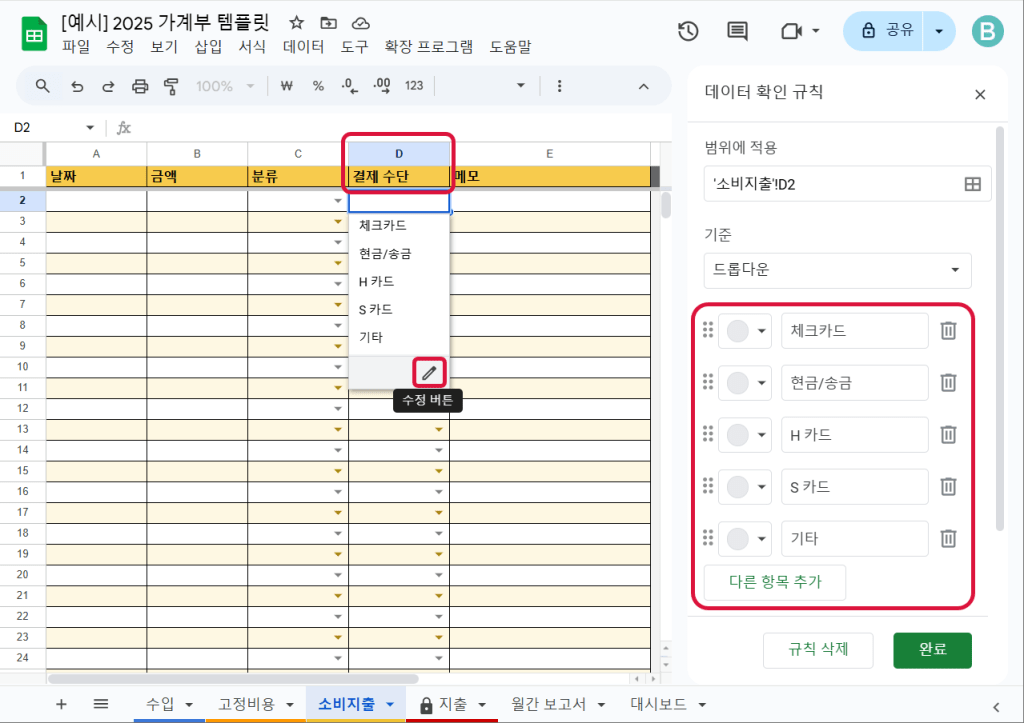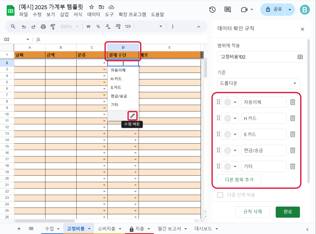 C열 분류, D열 결제 수단의 드롭다운 제일 아래 수정버튼을 클릭하여 데이터 확인 규칙 메뉴를 열어주세요. 필요없는 항목을 삭제하거나 필요한 다른 항목을 추가해주세요.