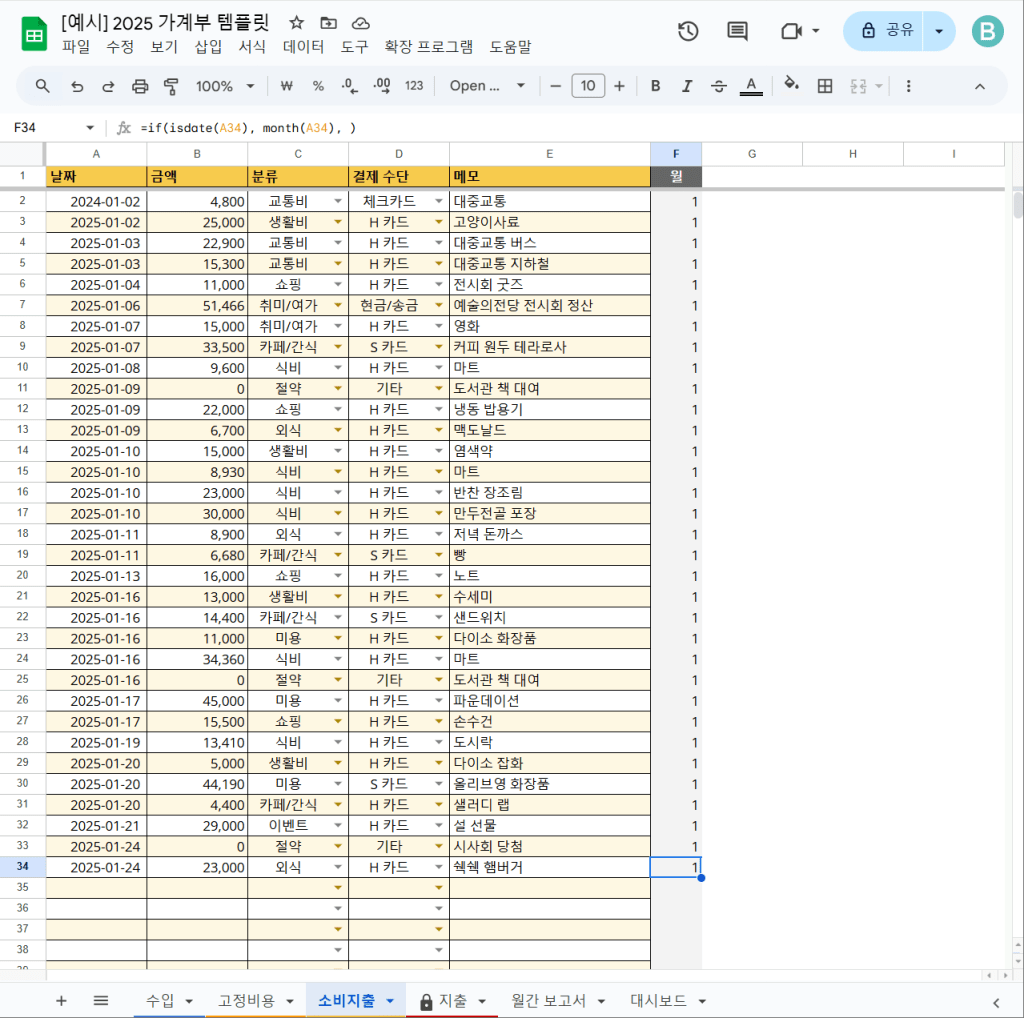 가계부 템플릿 > 소비지출 시트 데이터 입력 예시