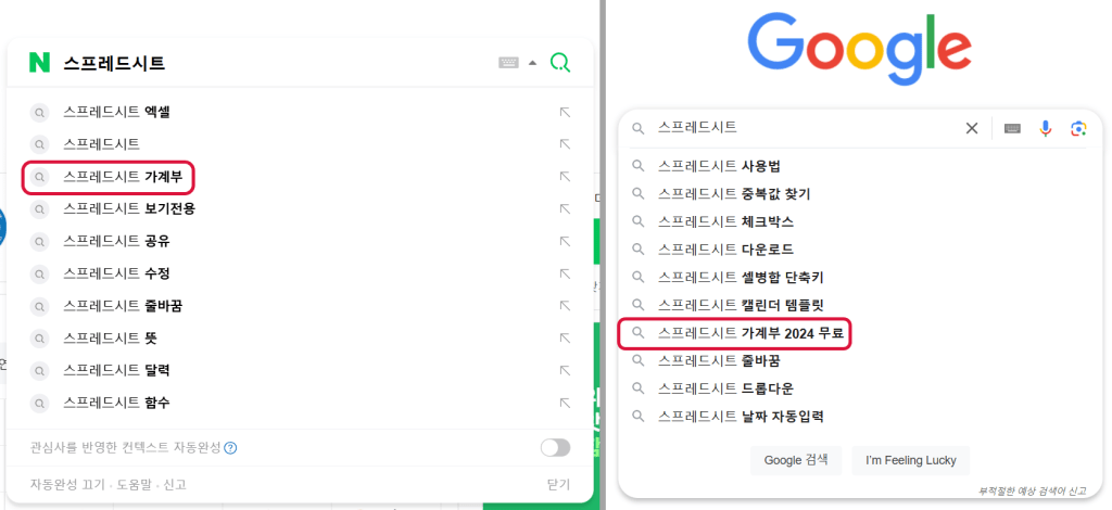 제 스프레드시트 동영상 강의 후기 중에 가계부를 쓰기 위해서 강의를 들으셨다는 내용이 있었고, 네이버나 구글에서 스프레드시트를 검색하면 연관 검색어에도 반드시 가계부 키워드가 있는 것을 확인할 수 있었습니다.