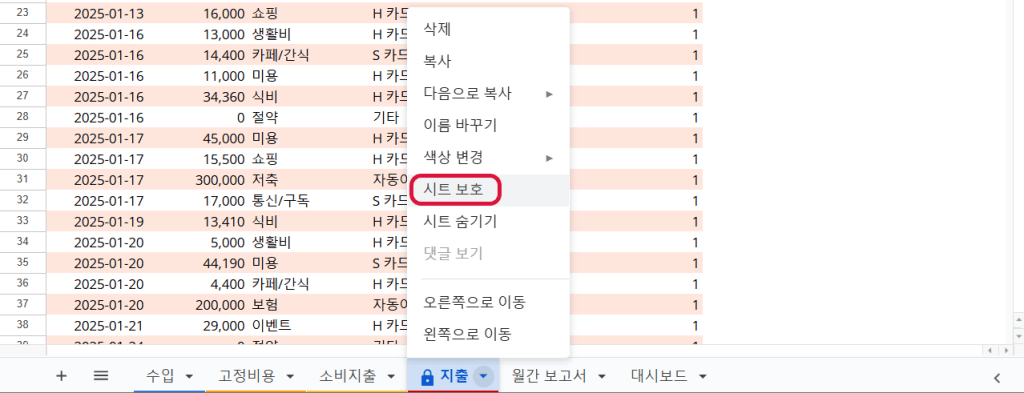 가계부 템플릿 > 지출 시트 > 시트 보호