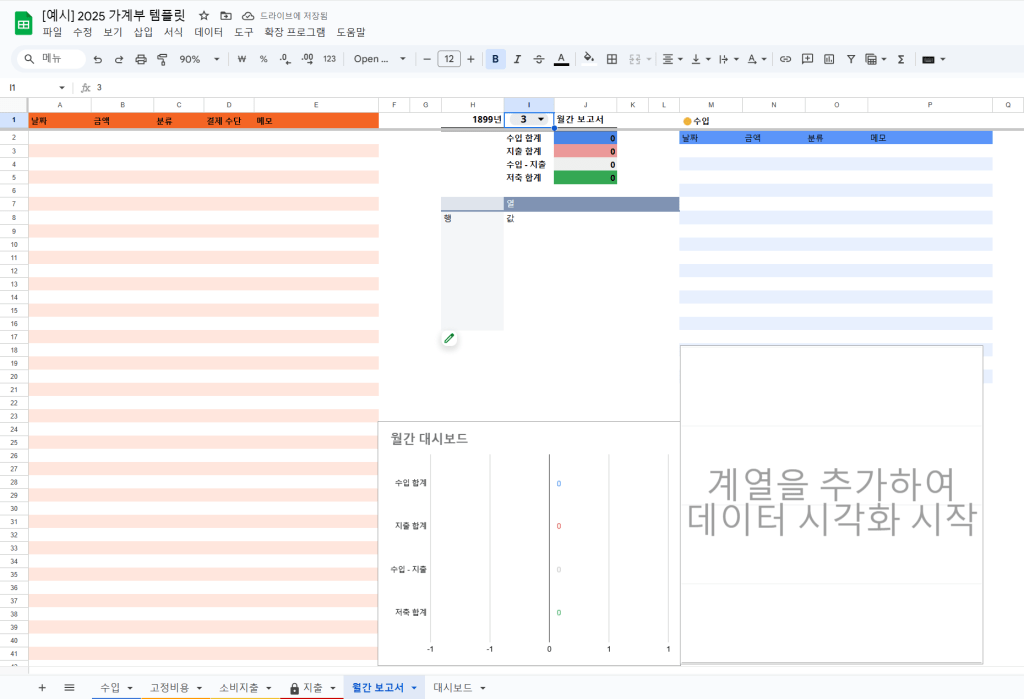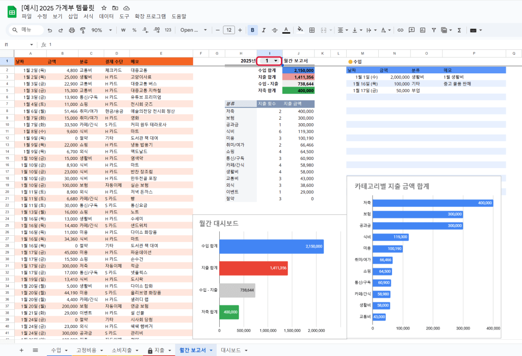앞에 있는 수입, 고정비용, 소비지출 시트에 수입과 지출 데이터를 입력하면 월간 보고서 시트에서 지정한 달의 한달치 내역을 확인할 수 있습니다.