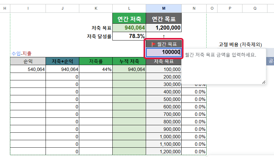 가계부 템플릿 > 대시보드 > 월간 목표 입력 예시