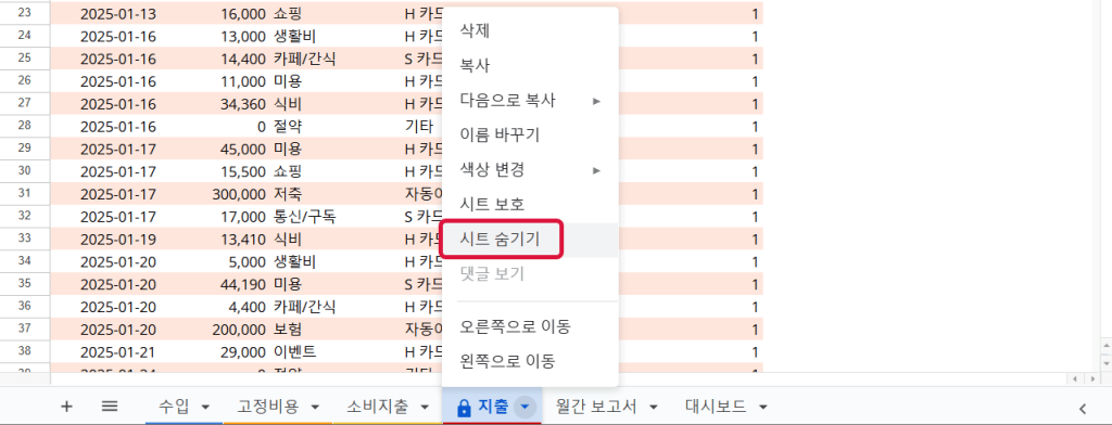 가계부 템플릿 > 지출 시트 > 시트 숨기기 예시