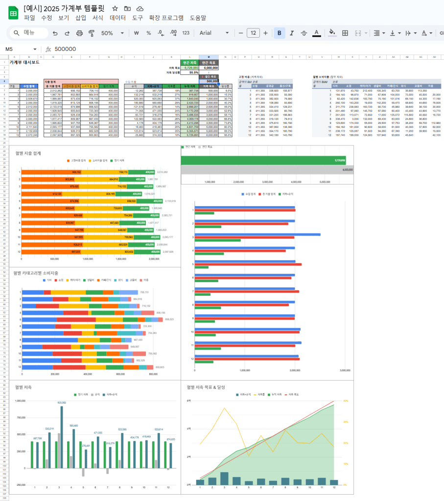 가계부 템플릿 > 대시보드 시트 1년치 데이터를 입력한 예시