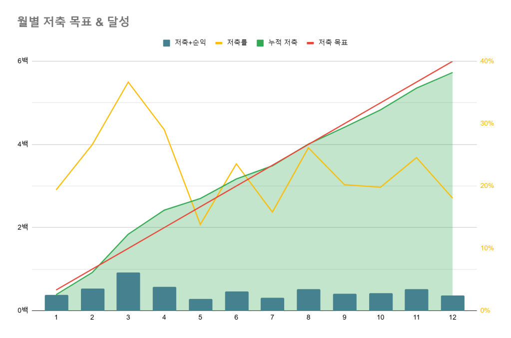 가장 마지막 그래프를 크게 보여드리자면 월간 저축 목표와 실제 월간 저축 금액, 누적 저축 금액을 보기쉽게 만들어두었습니다. 저축 목표를 달성하는데 도움이 되길 바랍니다.