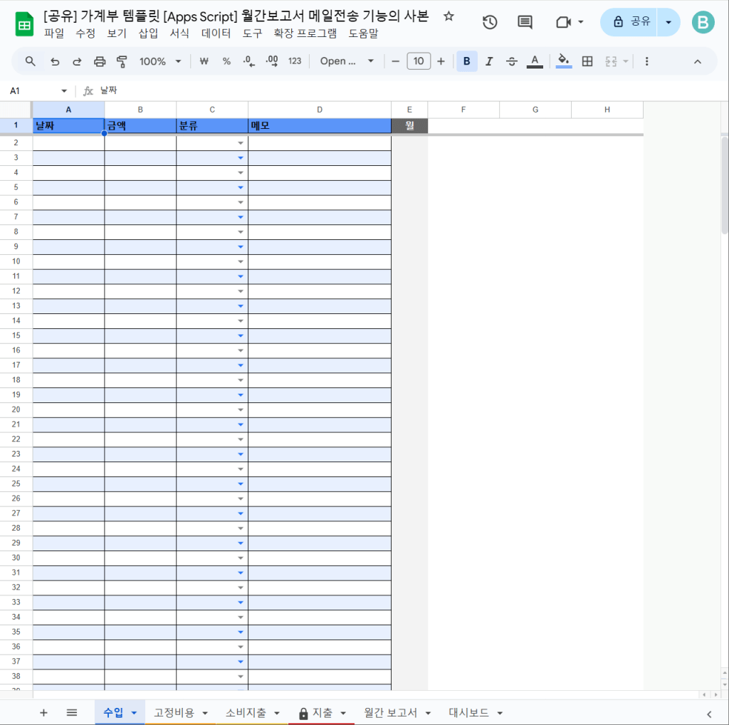 ⭐ 공유 스프레드시트: [공유] 가계부 템플릿 [Apps Script] 월간보고서 메일전송 기능