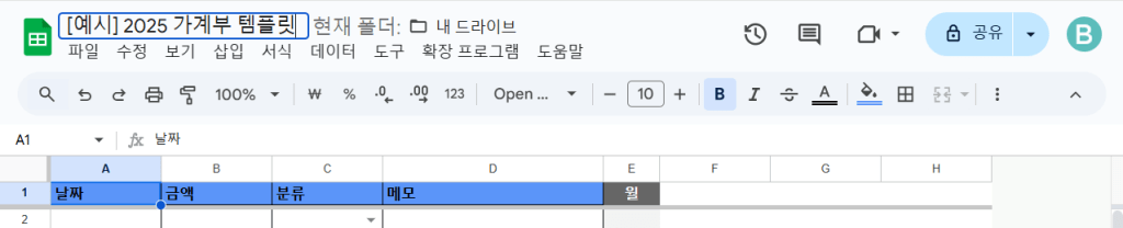 예시에서는 “[예시] 2025 가계부 템플릿”으로 변경했습니다.
