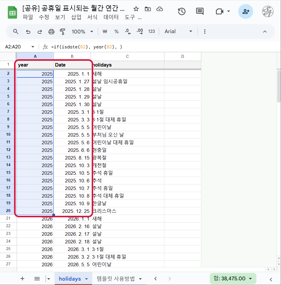 Query함수로 holidays 시트에서 공휴일 목록 가져오기