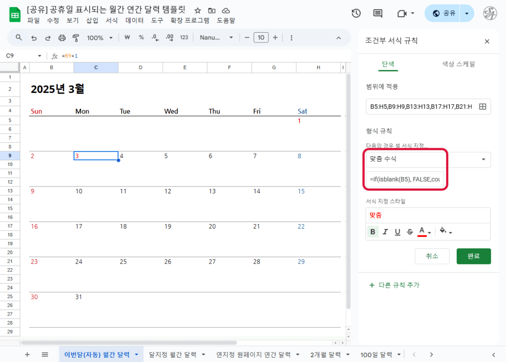 그리고 달력에서 날짜가 표시될 수 있는 모든 셀에 조건부 서식을 설정해두었습니다.