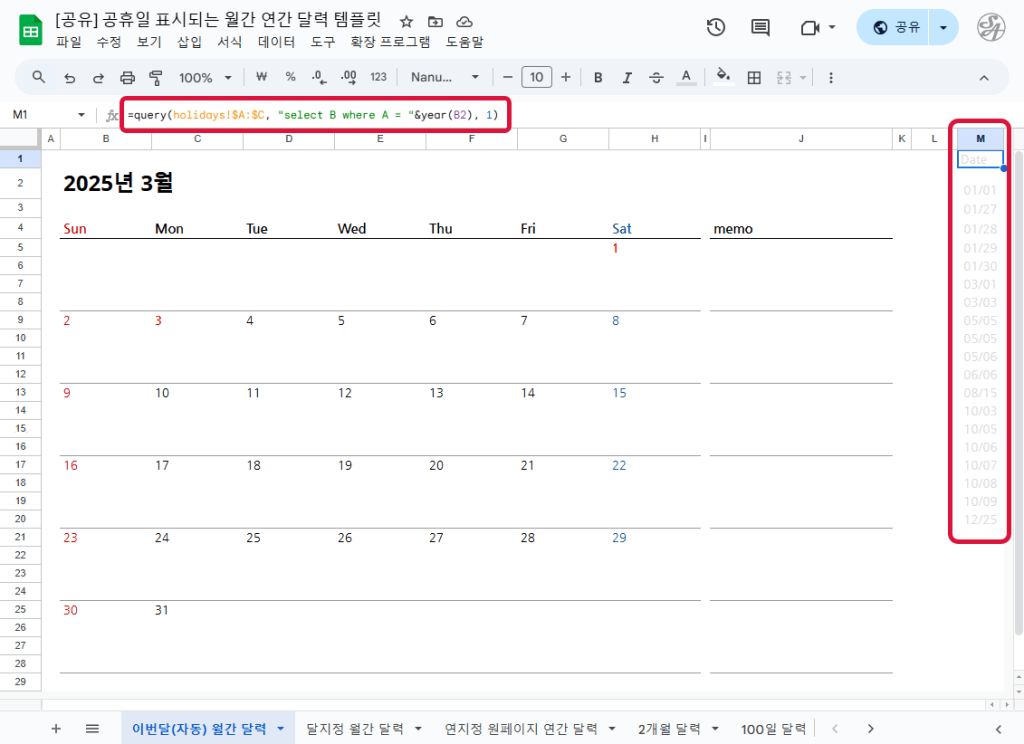예시를 보시면, 2025년도 3월의 달력이라 2025년도의 공휴일 날짜 목록을 M열에 표시하고 있습니다.