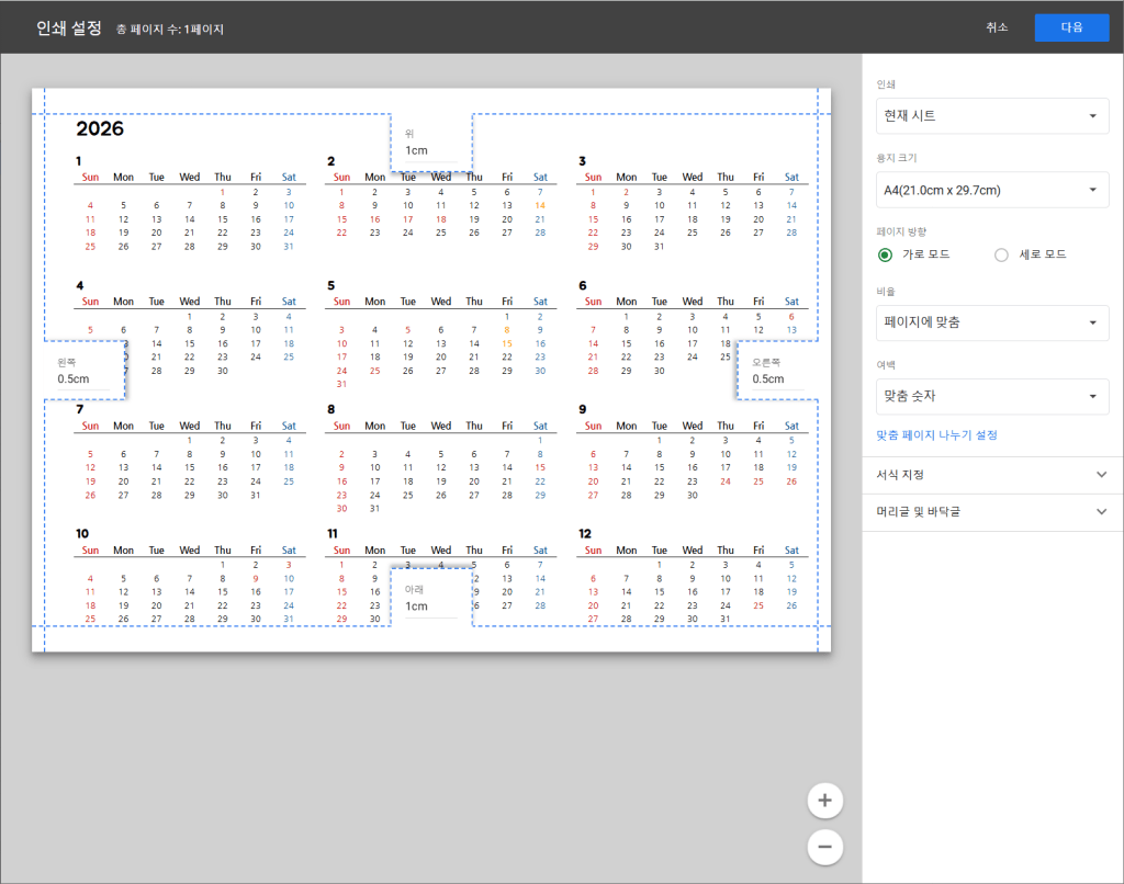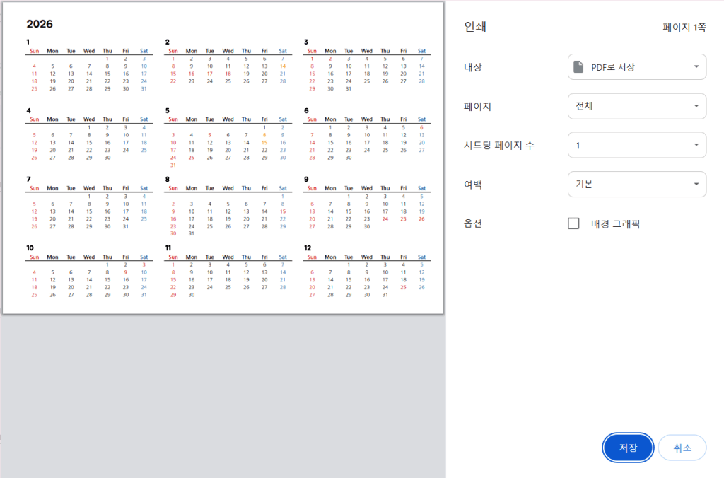 연간 달력 시트에 원하는 연도를 지정한 후, 상단의 인쇄 버튼을 클릭하여 연간 달력을 PDF로 저장할 수 있습니다.
