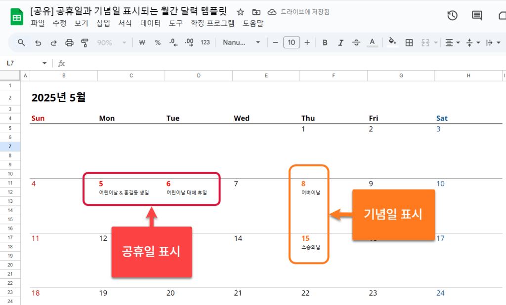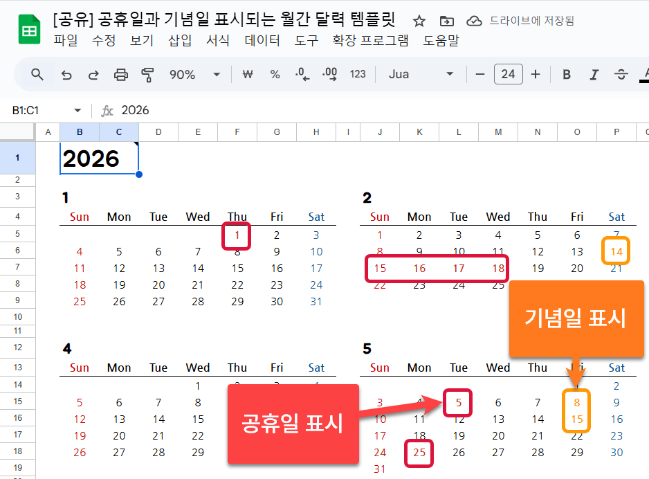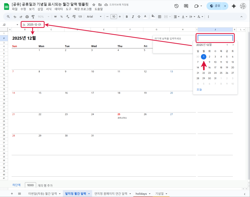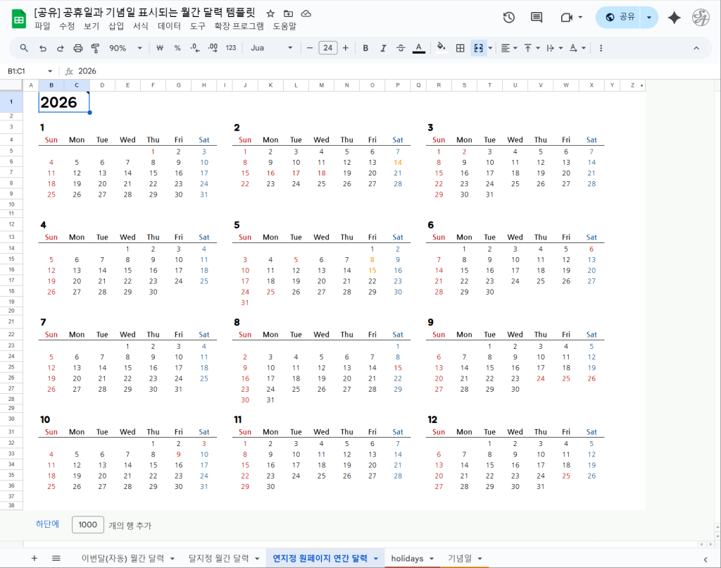 - [스프레드시트 활용] 공휴일 표시되는 월간 연간 달력 템플릿 공유 및 사용방법
