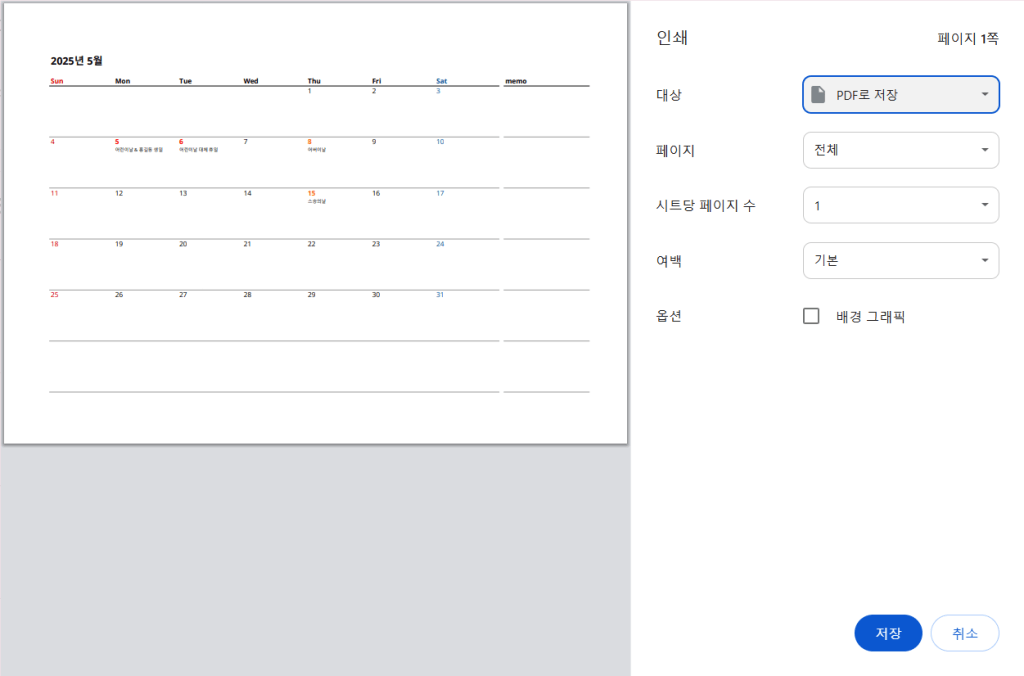 월간 달력 시트에 원하는 달을 지정한 후, 상단의 인쇄 버튼을 클릭하여 월간 달력을 PDF파일로 저장할 수 있습니다.