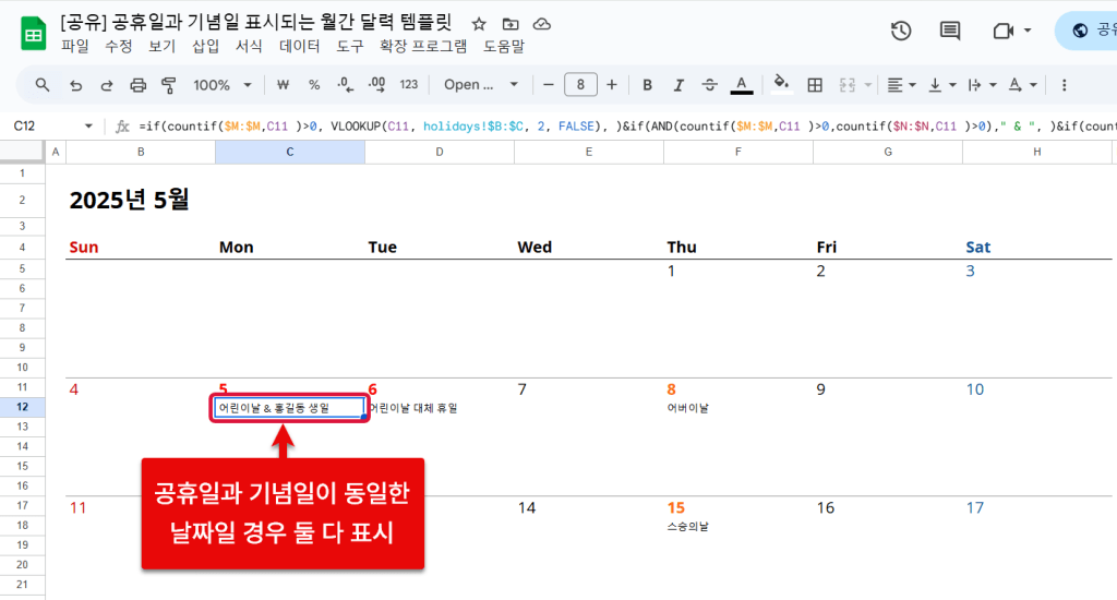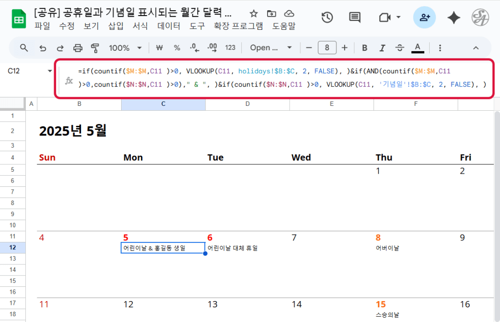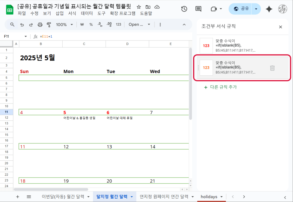 위에서 알려드린 모든 달력 시트에서는 holidays 시트에서 공휴일 정보를 참고하고 있습니다.