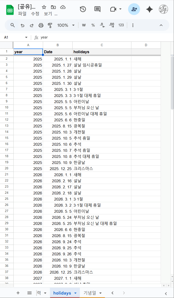 공휴일을 추가하실 때에는 이전 포스팅의 holiday 시트에 공휴일 추가하는 방법 을 참고해 주시기 바랍니다.