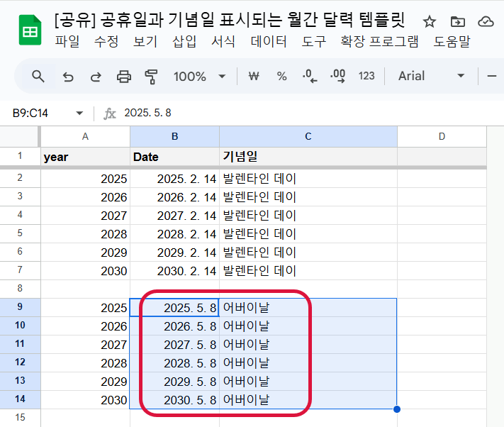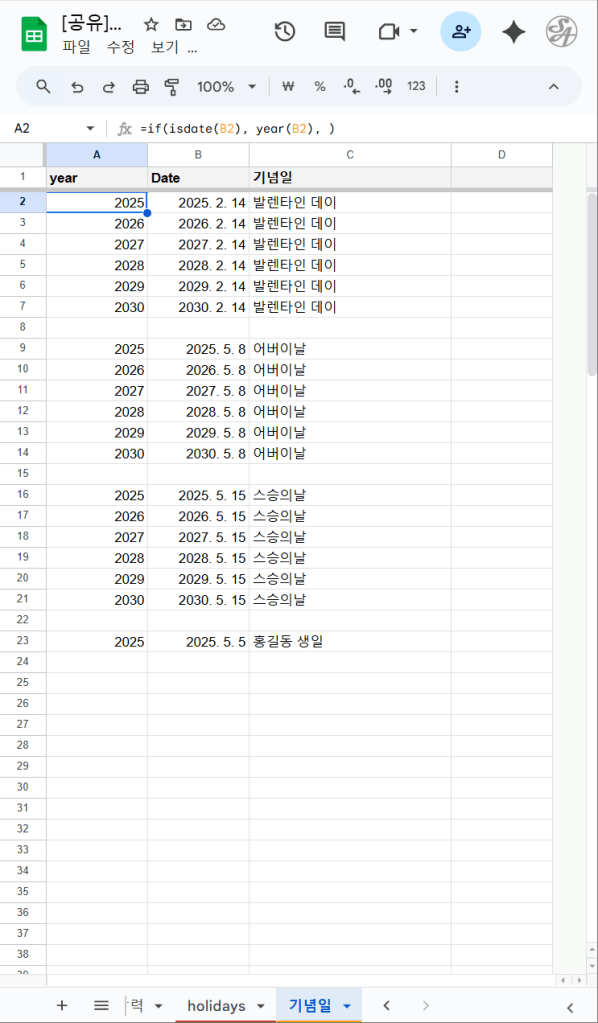 기념일 중에 음력 날짜가 있다면 해당 날짜를 양력으로 변환해서 입력해 주시기 바랍니다. 안타깝게도 스프레드시트에서는 음력-양력 변환을 지원하지 않습니다.