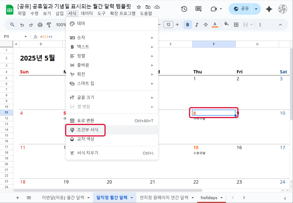 - [스프레드시트 활용] 달력에 공휴일 빨갛게 표시하는 방법