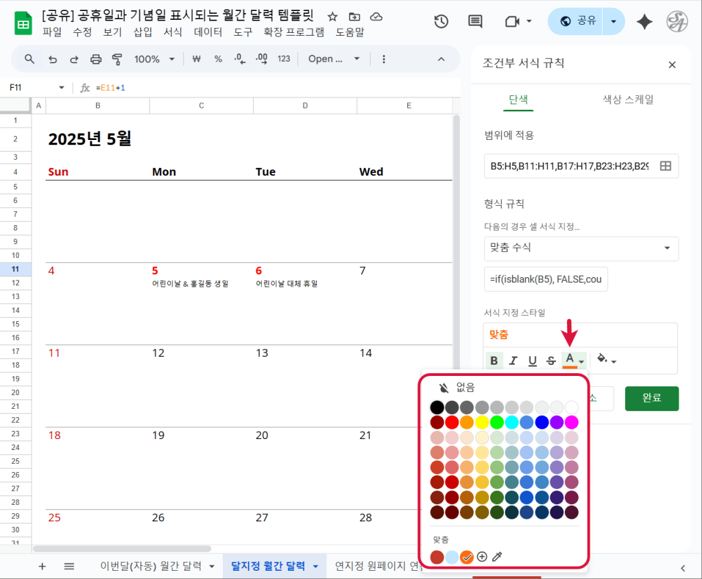 공유해 드린 템플릿에서는 기념일을 주황색으로 표시하도록 설정해두었습니다. 혹시 기념일의 색상을 변경하고 싶으시다면 조건부 서식 설정에서 서식을 변경해 주시면 됩니다.