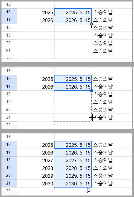 매년 반복되는 날짜는 자동 완성 기능을 활용하면 비교적 쉽게 여러 개로 만들 수 있습니다.