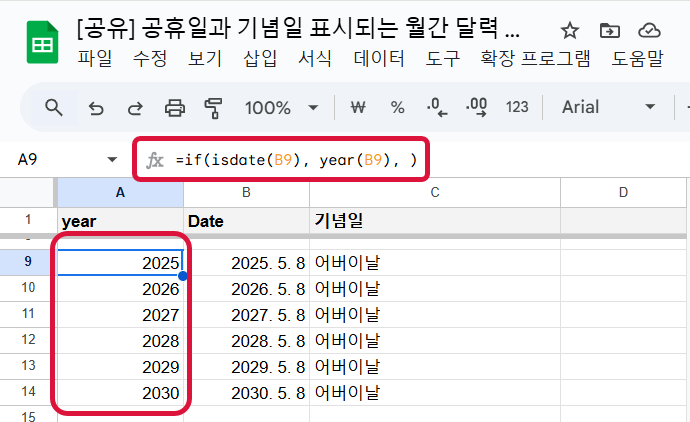 - A열에는 B열의 날짜에서 연도를 추출하는 수식이 입력되어 있습니다.